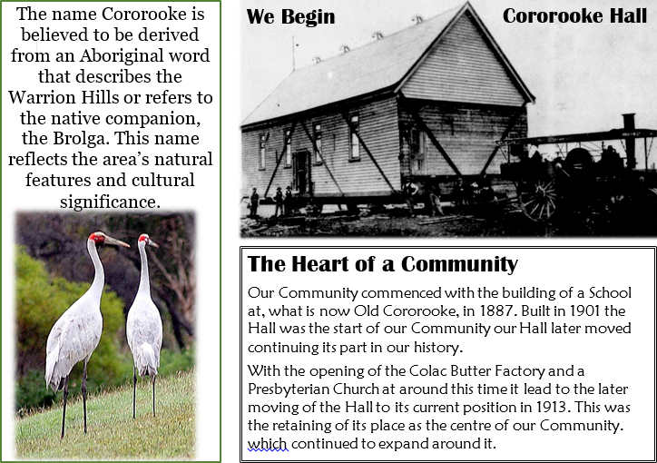 The Cororooke Hall was moved to its current location on the 14th of August 1913 following the building of the Colac Dairying Company (CDC) Butter Factory around the same time, thus helping to establish the new community of Cororooke.  The Hall was moved using a steam traction engine from it previous location approximately 1.5km south at what is now known as Old Cororooke.