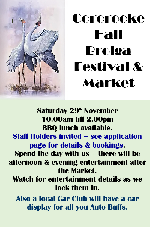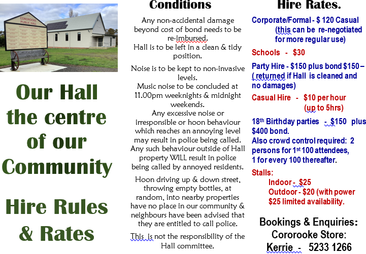 Hall Hire Contact: Cororooke General Store  5233 1266